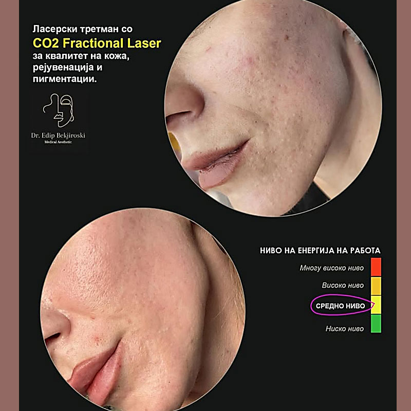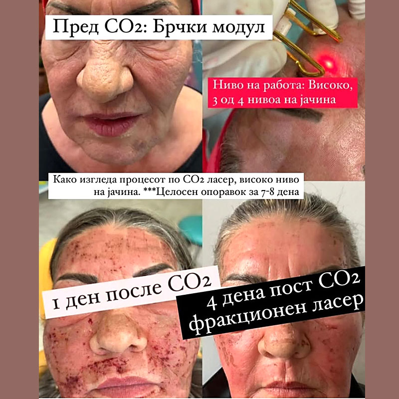 Процедурата со CO2 фракциониот ласер е минимално инвазивна и може да има одредено време на опоравување, зависно од интензитетот на третманот. По третманот, пациентите може да се соочат со привремено црвенило, оток или пилинг на кожата, но резултатите се видливи во рок од неколку недели до месеци, кога кожата изгледа појасна, посвежа и помлада.